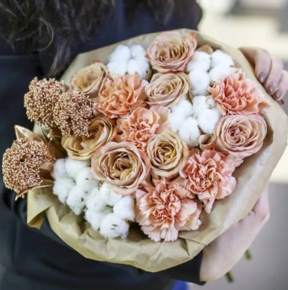 Букет из диантусов и роз с добавлением хлопка