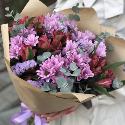 Букет из хризантем и альстромерий с добавлением статицы "Лесная нимфа"