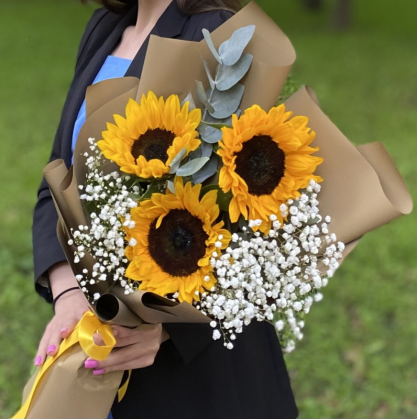 Оригинальный букет из подсолнухов и гипсофилы с добавлением эвкалипта в стильном оформлении