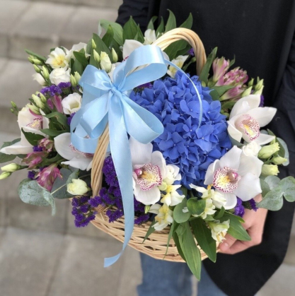 Корзина с гортензией и орхидеей "Жаклин" с добавлением эустомы и альстромерий